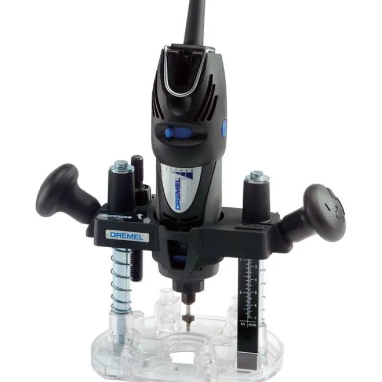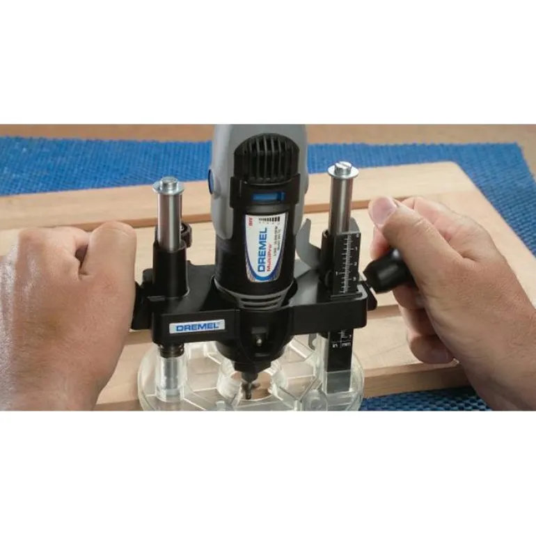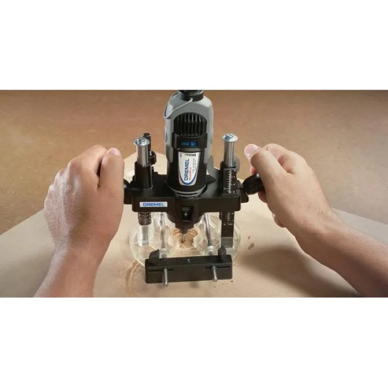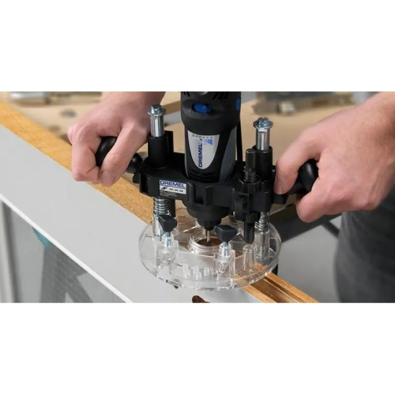 Työntöjyrsinlisälaite, joka teke Dremel-työkalustasi yläjyrsimen. Täydellinen ympyröiden, kylttien ja upotusten tekoon sekä koristereunusten ja reunan suuntaiseen jyrsintään.