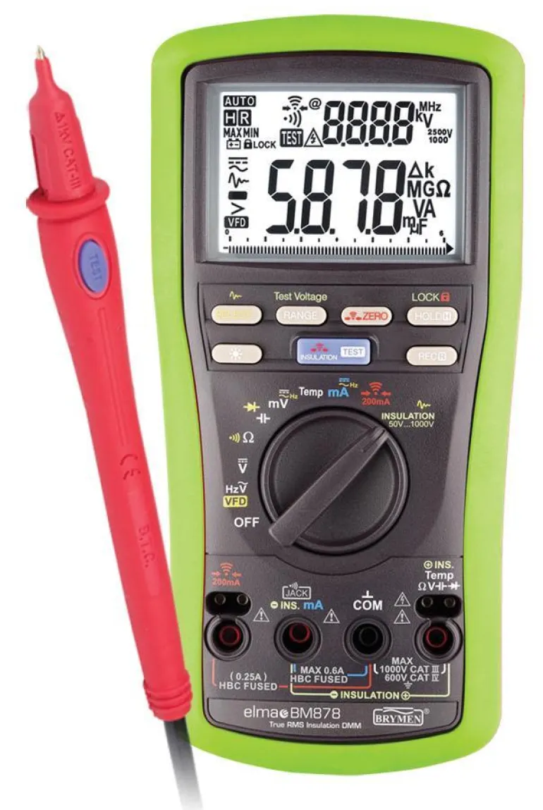 Eristysvastusmittarissa on viisi valinnaista testijännitettä. Laitteessa on myös sisäänrakennettu 200 mA:n ohmimittari jatkuvuuden mittaamiseen. Varustettu suurella, valaistulla kaksoisnäytöllä ja nopealla, analogisella pylväsdiagrammilla. Laite mittaa TRMS-jännitettä, virtaa, taajuutta, vastusta, kapasitanssia, diodeja, jatkuvuutta ja lämpötilaa. Elma BM 878:ssa on useita lisätoimintoja, kuten maks./min, tietojen pito, automaattinen sammutus, automaattinen/manuaalinen alueen valinta ja VFD-toiminto, jonka avulla laite voi mitata oikeat arvot taajuusmuuttajan jälkeen. Yleismittari täyttää standardin EN61010-1 KAT IV 600 V vaatimukset.