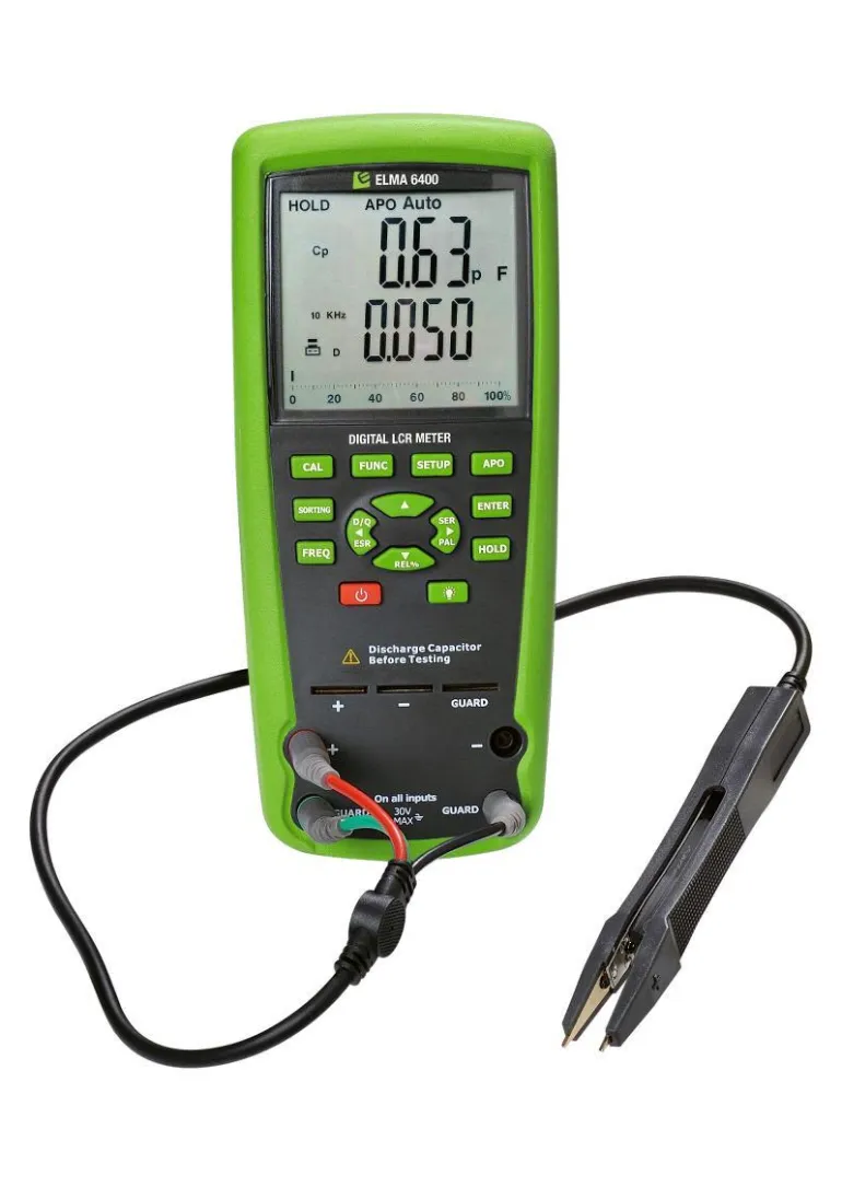 Vankka LCR-mittari, jossa on monia alueita ja toimintoja. Laitteessa on suuri kaksoisnäyttö, jossa on pylväskaavio ja taustavalo, joka näyttää tarkat mittaukset selvästi. Elma 6400 löytää oikean alueen älykkäällä automaattisella asteikolla. Laite on täydellinen erilaisten elektronisten komponenttien tarkastamiseen sekä kelojen ja moottorin käämien testaamiseen. Mittaa induktanssin, kapasitanssin ja vastuksen jopa 10 kHz:n mittaustaajuudella. Laitetta voidaan käyttää myös komponenttien lajitteluun. Valitse LAJITTELUTOIMINTO ja testattavan komponentin sallittu poikkeama – laite näyttää silloin mittausarvon sijaan tiedon FAIL tai PASS.