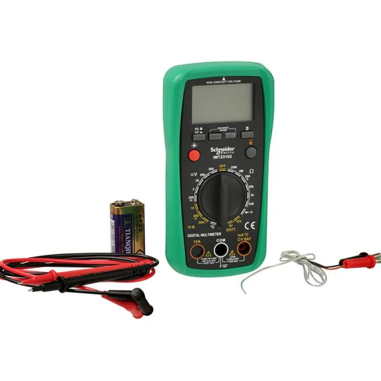 Schneider IMT23102 on digitaalinen yleismittari DC- ja AC-jännitteen, virran, resistanssin, diodien ja jatkuvuuden mittaamiseen. Yleismittarissa on myös akkujen testaustoiminto ja se toimitetaan 9 V -paristolla.