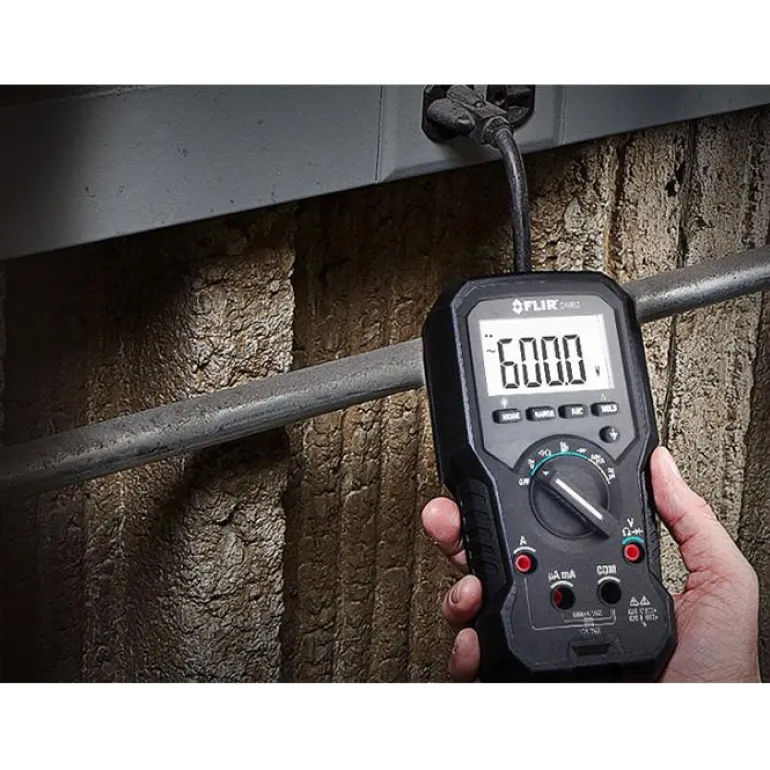 FLIR DM62 on kompakti digitaalinen yleismittari, True RMS AC/DC-jännite ja virta, jännitteen tunnistus ilman kontaktia, VFD ja jännitemittausalue 600 V:iin asti.