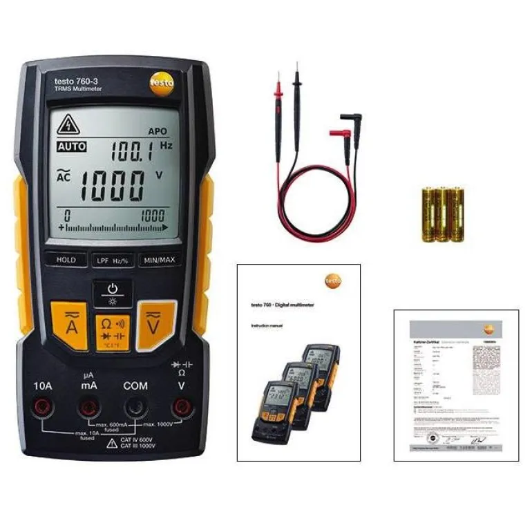 Testo 760-3 on suorituskykyisin malli, ja siinä on kahden muun mallin toimintojen lisäksi enintään 1000 V:n jännitealue. Sillä on myös korkeammat taajuuden ja kapasitanssin mittausalueet.
