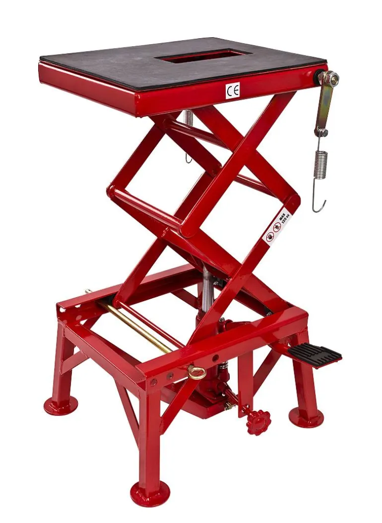 Yleisnostin (moottoripyöränostin), joka soveltuu esim. moottoripyörän, mopon tai puutarhakoneen nostamiseen. Jousilukko, joka kiinnittää nostettavan kohteen.