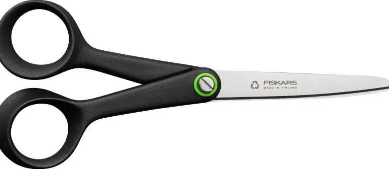 Pienet Fiskars Functional Form ReNew -yleissakset soveltuvat täydellisesti monenlaisiin kodin leikkuutöihin, ja ne on valmistettu vähintään 70 %:sti kierrätysmateriaaleista. Korkealaatuiset ruostumattomasta teräksestä valmistetut terät takaavat erinomaisen leikkuutehon erilaisia kevyempiä kodin materiaaleja käsitellessä. Kierrätysmuovin ja lasikuidun yhdistelmästä valmistettu ergonominen kädensija tarjoaa ainutlaatuisen käyttömukavuuden ja hyvän otteen. Sakset on valmistettu Fiskarsin ympäristösertifioidulla Suomen tehtaalla, ja ne on viimeistelty käsin. Sakset sopivat oikeakätisille. Muiden Fiskars-tuotteiden tapaan sakset on suunniteltu kestämään aikaa ja käyttöä.