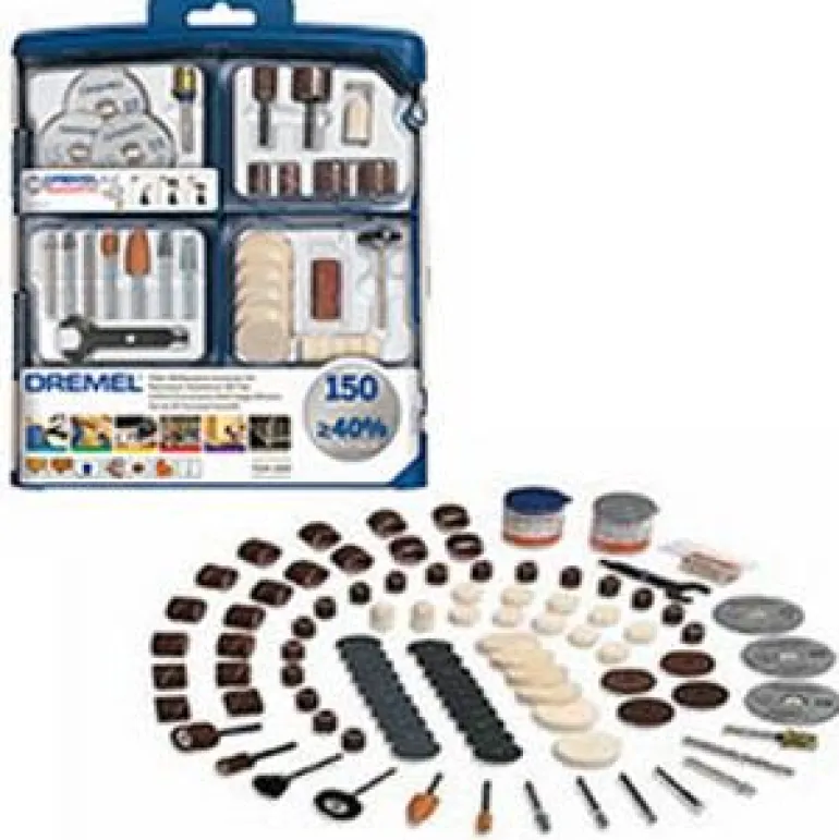 Yleistarvikesarja, 150 osaa. Mukana EZ SpeedClic -tarvikkeet, jotka mahdollistavat nopean ja vaivattoman tarvikkeiden vaihdon ilman avainta. Tätä tarvikesarjaa voi käyttää moniin eri materiaaleihin monissa eri projekteissa ja sovellusalueilla. Dremel-lisävarusteita on kätevä pitää varustelaukussa.