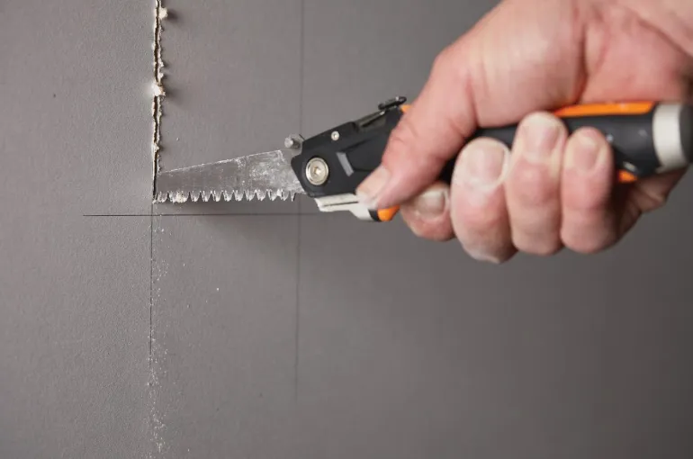 Yleisveitsi optimoitu kipsilevyn leikkaamiseen. Veitsessä esiasetetut syvyysasennot. Varaterien integroitu säilytystila. Sisäänrakennettu kipsisaha. Täysin metallinen.