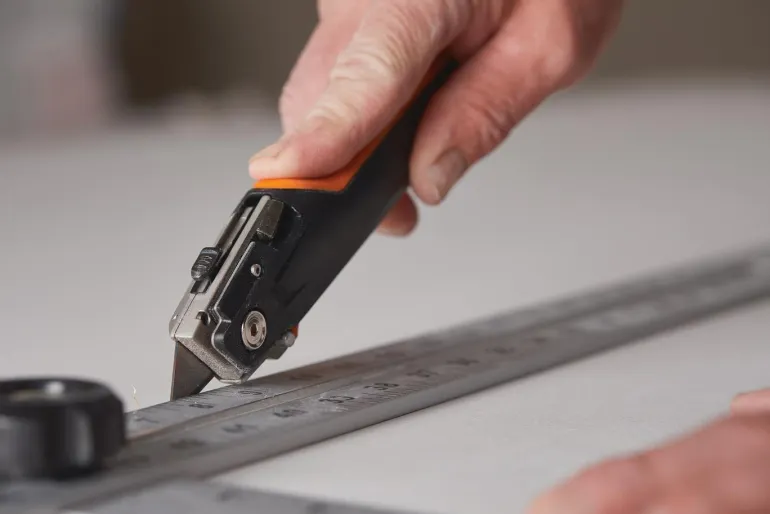 Yleisveitsi optimoitu kipsilevyn leikkaamiseen. Veitsessä esiasetetut syvyysasennot.