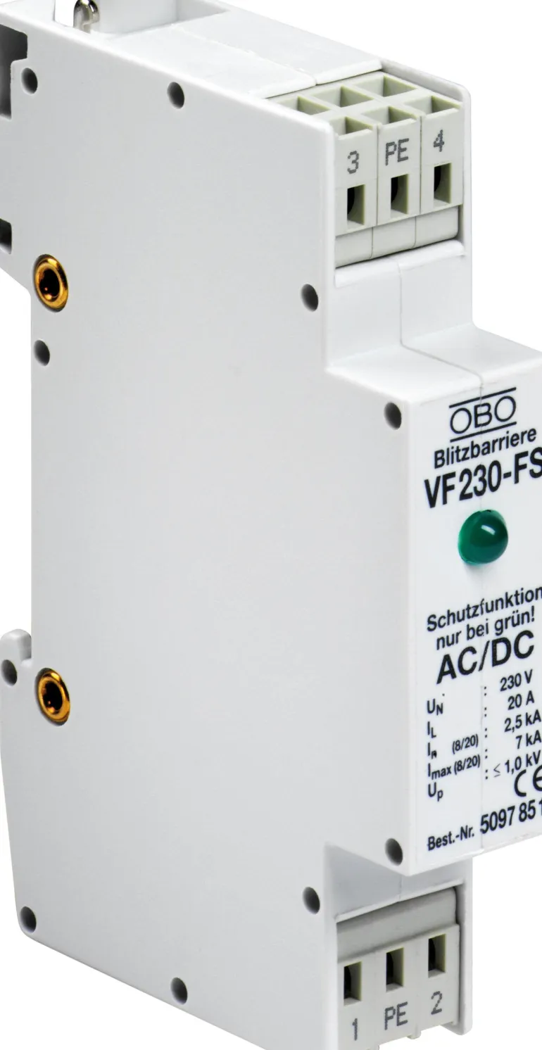 Elektronisten laitteiden hienosuojaus. Kiinteästi laitekaappiin asennettava ylijännitesuoja. Suoja on tarkoitettu asennettavaksi tietokoneiden, modeemien, prosessinohjauksen ja muiden elektronisten laitteiden virtapiiriin. Suojapiirit koostuvat sinkkioksidivaristoreista ja kaasunpoistosta. Vihreä merkkivalo ilmaisee oikean toiminnon. Suojia on saatavilla eri nimellisjännitteille. VF-FS-malli on varustettu apukoskettimella etämerkinantoa varten vikatilanteessa.