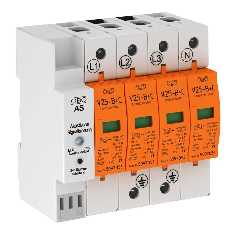 Yhdistelmäsuoja, 4-napainen, akustisella merkinannolla. Kokonainen yksikkö, joka koostuu yläosasta ja alustasta, valmiiksi koottuna ja liitäntävalmiina. Soveltuu TN-verkkojärjestelmiin. Toimintojen seurantaan tarkoitettu äänimerkki voidaan kytkeä pois päältä 24 tunnin toistolla. Tulppasuoja dynaamisella erotuslaitteella. Näyttötoiminnon näyttö. Jännitteen suojaustaso sisäänrakennettu, sammuttamaton sinkkivastuksen pidike käytettäväksi tavallisissa kaupallisissa jakelutaloissa. Merkityt liitännät