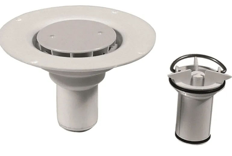 Ylivuotosuoja vesilukkoelementillä ja hajulukolla. Ulostuloaukko pohjassa, halkaisija 150 mm. Liitettäväksi muovimattoon.