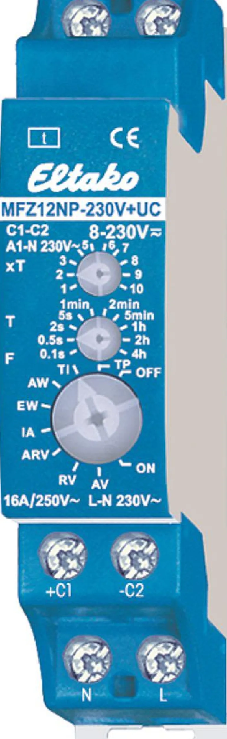 Aikarele, jossa nollapistekytkentä koskettimien ja kuorman suojaamiseksi. Tämä pidentää erityisesti energiansäästölamppujen käyttöikää. Kytkentäkapasiteettia lisääviä koskettimia ei saa liittää sarjaan tämäntyyppisiin laitteisiin. Hybriditekniikkaa, jossa yhdistyvät kulumattoman elektronisen ohjauksen sekä tehokkaiden erikoisreleiden suurimmat edut. Säädettävä aika 0,1 sekunnista 40 tuntiin. Aika T asetetaan keskimmäisellä T-kiertokytkimellä. Mahdolliset asetusalueet ovat: 0,1, 0,5, 2 tai 5 sekuntia; 1, 2, tai 5 minuuttia tai 1, 2, tai 4 tuntia Kokonaisaika saadaan määrittämällä kerroin. Kerroin säädetään xT-kiertokytkimellä välille 1-10. Jos halutaan 0,1 sekunnin viive, T-kiertokytkin asetetaan arvoon 0,1 ja xT-kiertokytkin arvoon 1. Jos halutaan 40 tunnin viive, T-kiertokytkin asetetaan arvoon 4 tuntia ja xT-kiertokytkin arvoon 10.