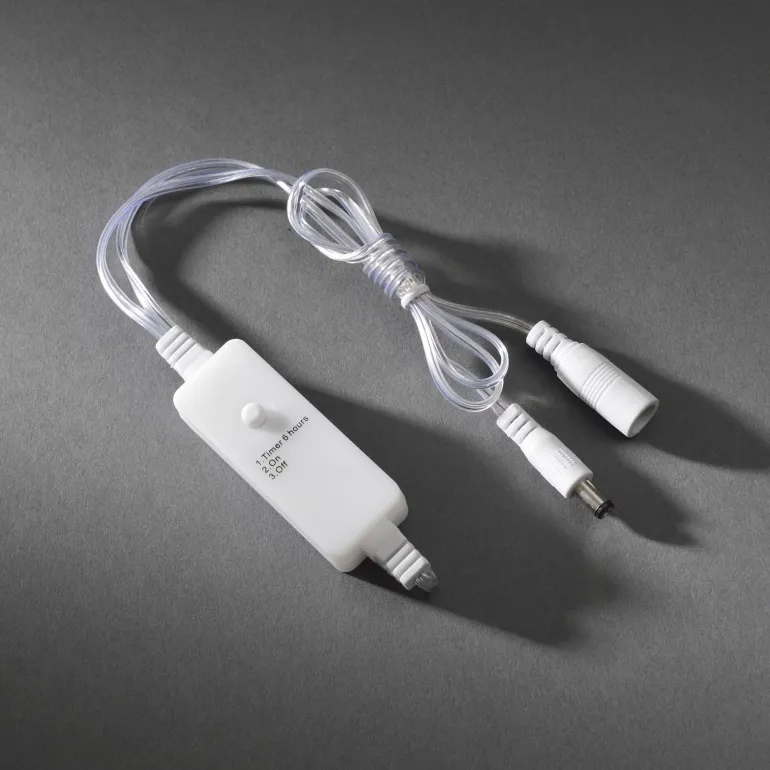 Konstsmide 3608-013 on ajastin 6 h. Sopii sisäkäyttöön. Valkoinen pehmeä johto. 24 V/IP20.