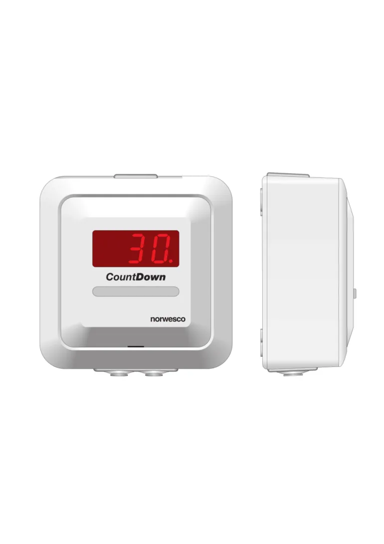 Elektroninen suojausajastin, jossa on digitaalinen näyttö jäljellä olevasta toiminta-ajasta 1–999 min. Iskunkestävästä kestomuovista valmistettu valkoinen kotelo, suojausluokka IP20.