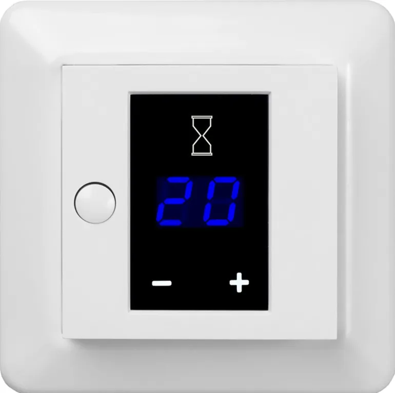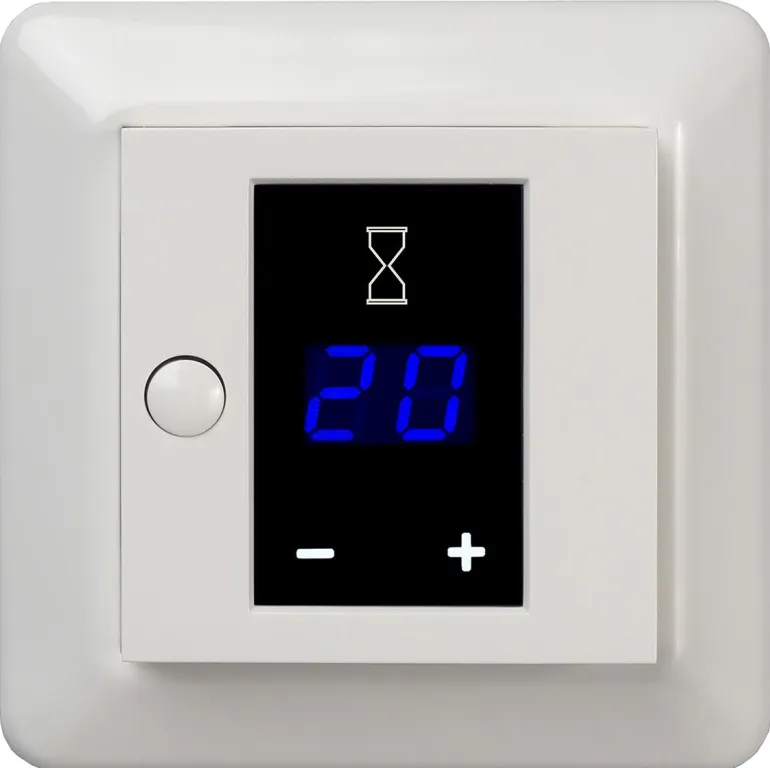Ajastin, joka näyttää jäljellä olevan ajan ennen virran katkaisua. Ohjelmoitavissa päällä/päällä tai päällä/pois päältä. Tulo ulkoista ohjausta varten painikkeella. Mahdollisuus rajoittaa sekä enimmäis- että vähimmäisaikoja. 16A, 2-napaiset mekaaniset kytkimet. Asennussyvyys 25 mm.