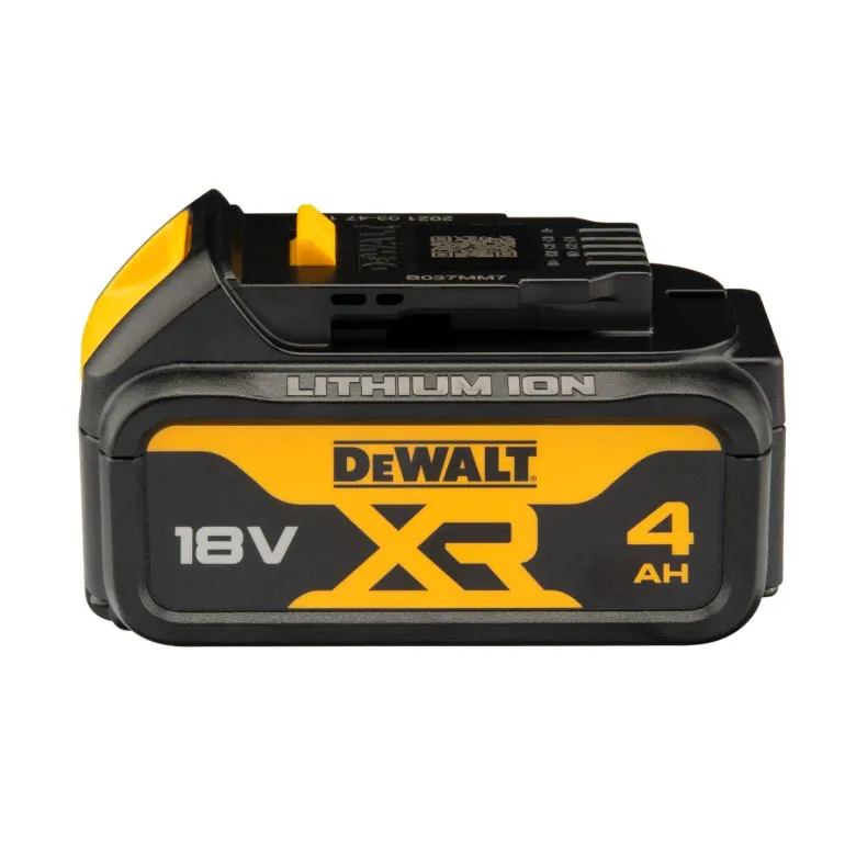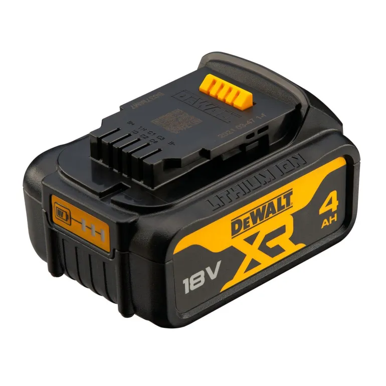 DCB182 18V XR 4Ah -akku, joka on yhteensopiva kaikkien Dewalt 18V XR -työkalujen kanssa. Akku ei ole suurempi eikä painavampi, mutta se tarjoaa pidemmän käyttöajan kuin edellinen 3 Ah:n akku, ja siinä on sisäänrakennettu LED-ilmaisin välitöntä akun tilaa seurantaa varten.