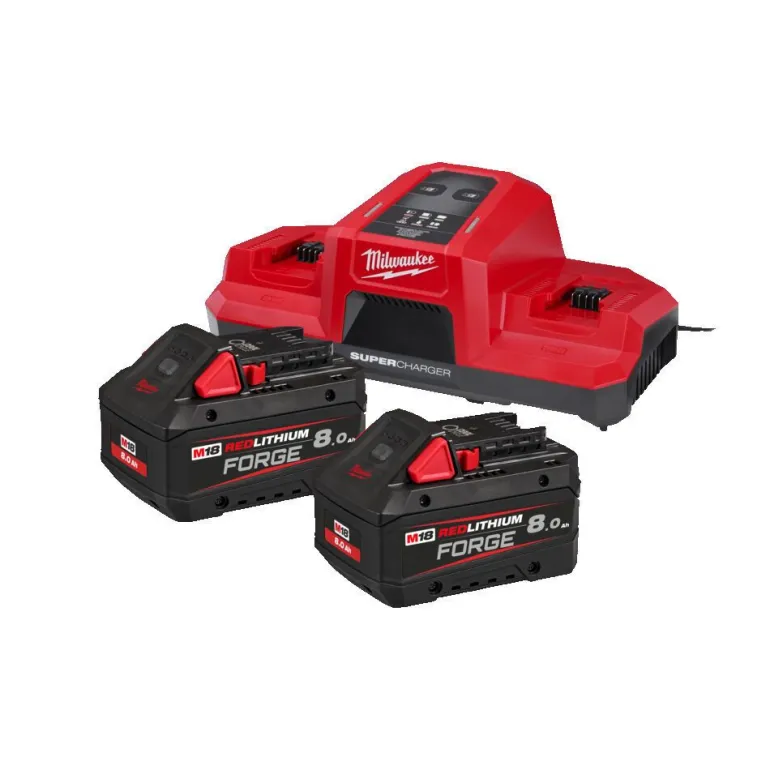 MILWAUKEE M18™ FORGE™ -akku- ja laturipaketti, joka sisältää 2 x M18™ FORGE™ FB8 8,0 Ah -akkua ja M18™ DBSC 2-paikkaisen pikalaturin (45 min). Setti on yhteensopiva kaikkien M18™ -akkutyökalujen kanssa.