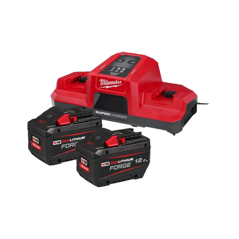 MILWAUKEE M18™ FORGE™ -akku- ja laturipaketti, joka sisältää 2 x M18™ FORGE™ FB12 12,0 Ah -akkua ja M18™ DBSC 2-paikkaisen pikalaturin (45 min). Setti on yhteensopiva kaikkien M18™ -akkutyökalujen kanssa.