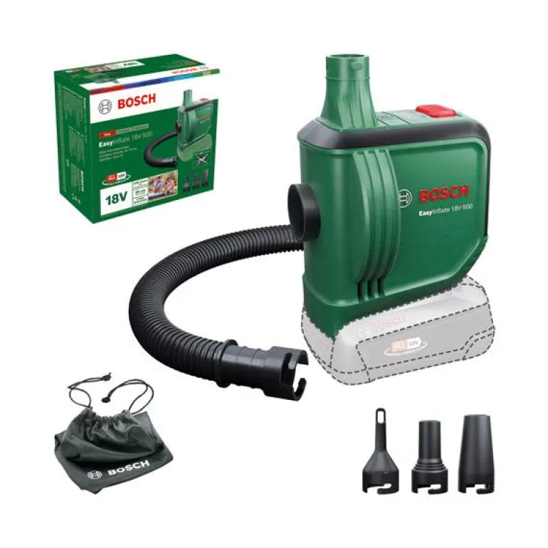 Maks. 530 l/min tuoton tarjoava Bosch EasyInflate 18V-500 akkuilmapumppu mahdollistaa uima-allaslelujen, kumiveneiden, ilmapatjojen ja muiden suurikokoisten esineiden huippunopean ja vaivattoman täyttämisen ja tyhjentämisen. 50 cm:n letku ja kätevä käynnistyskytkin mahdollistavat miellyttävän käytön. Kompaktin pumpun vakiovarustuksessa on kolme suutinta erikokoisille venttiileille ja säilytyspussi, jossa pumppu on helppo kuljettaa uima-altaalle, järvelle tai telttaretkelle. Tämä ilmapumppu kuuluu 18V POWER FOR ALL -järjestelmään. Samaa akkua voi käyttää kaikissa 18V POWER FOR ALL -työkaluissa, mikä lisää joustavuutta ja käyttömukavuutta.
