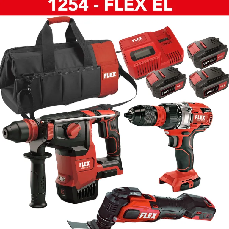 18 V -akkukonesarja, joka sisältää 2-nopeuksisen akkuporakoneen vaihdettavalla istukalla DD2G 18.0-EC C, 491225, akkuporavasaran CHE2-26 18.0-EC C 491314, akkumonitoimityökalun 18,0 V Starlock Max -kiinnityksellä MT18.0-EC C 518409 (tärinä vain 1,28 m/s²), pikalaturin 417882, työkalulaukun 502561 ja 3 kpl 5,0 Ah 445894 -akkuja.