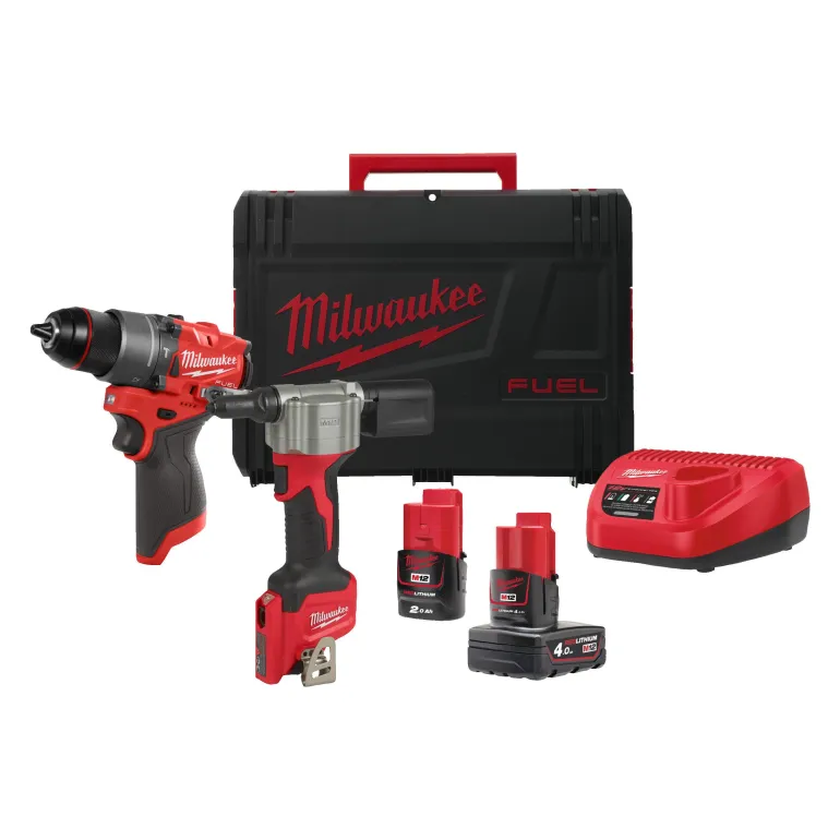 Milwaukee M12 FPP2D2-422X PowerPack on akkukonesarja, joka sisältää kompaktin M12 FPD2 FUEL™ -iskuporakoneen ja kompaktin M12 BPRT-0 -vetoniittikoneen. Mukana 1 x 2,0 Ah -Redlithium-akku, 1 x 4,0 Ah Redlithium-akku, 40/80 min M12 C12 C -laturi ja HD-säilytyslaatikko.
