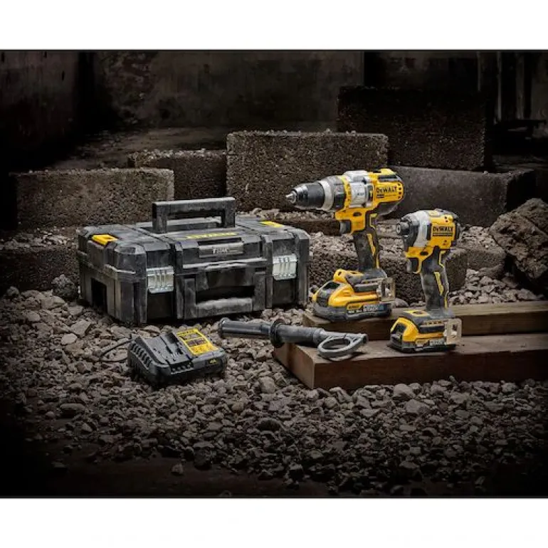 DEWALT DCK2052H1E1T-QW 18V XR on akkukonesarja, joka sisältää tehokkaan akkuiskuporakoneen, iskevän akkuruuvinvääntimen, akkuja, laturin ja säilytyslaatikon.