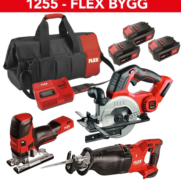 18 V -akkukonesarja, joka sisältää akkupistosahan JS18.0-EC C 26 mm 0-3500/min, 485403, akkupuukkosahan RSP DW 18.0-EC C heiluriliikkeellä ja erittäin alhaisella tärinällä 9,1 m/s², 491306, akkupyörösahan CS45 18.0-EC C 0-45 mm 5400/min, 517647, pikalaturin 417882, työkalulaukun 502561 ja 3 kpl 5,0 Ah 445894 -akkuja.