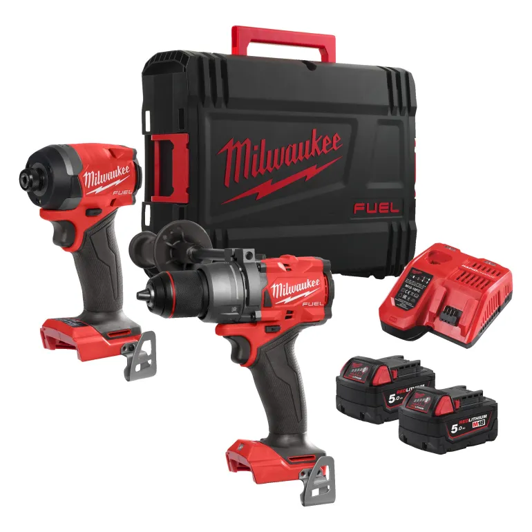 Milwaukee 4933480873 PowerPack (M18 FPP2A3-502X) on akkukonesarja, joka sisältää M18 FPD3 FUEL™ -iskuporakoneen ja M18 FID3 FUEL™ ¼″ HEX -iskevän ruuvinvääntimen. Mukana 2 x M18 5,0 Ah REDLITHIUM™-akkua, 59 min M12-18 FC -pikalaturi ja pinottava HD-säilytyslaatikko.