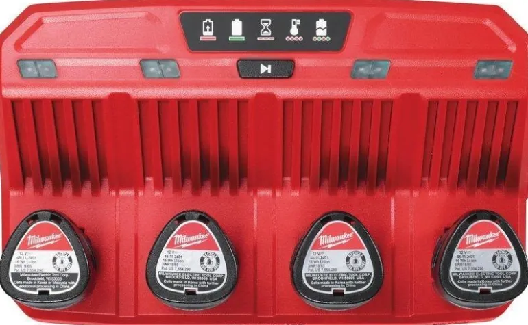 Milwaukee M12 C4 on 4-pistelaturi Milwaukeen 12 V:n litiumioniakuille. Lataa jopa 4 akkua vuorollaan järjestyksessä.