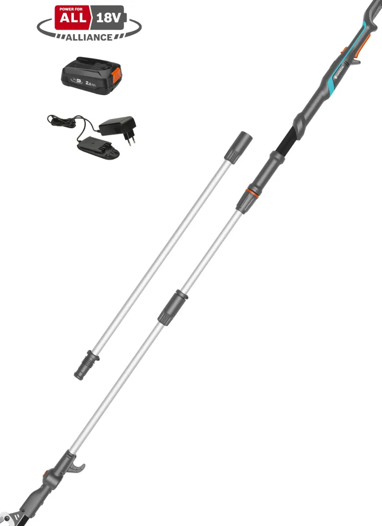 POWER FOR ALL -akku varmistaa, että leikkaaminen sujuu helposti, eikä siihen tarvita juurikaan voimaa. Alkuperäiset GARDENA-terät on valmistettu Saksassa karkaistusta teräksestä. Ne takaavat siistin leikkuujäljen ja sopivat tuoreen puun ja enintään 28 mm paksujen oksien leikkaamiseen. Terissä on tarttumaton pinnoite ja ne ovat tarkkuushiotut, joten oksat eivät tartu kiinni. Käytä kääntyvää ja ohutta leikkuupäätä yksittäisten oksien leikkaamiseen 60 asteen kulmassa. Taittuvan pään ansiosta näet myös leikattavan alueen. Jos oksat takertuvat puuhun, voit vetää ne alas varren yläosassa olevalla irrotuskoukulla.