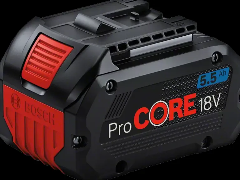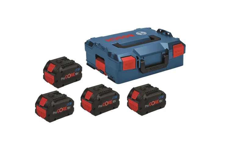 Bosch -akkusarja, joka sisältää 4 kpl ProCORE 18V 5.5 Ah -akkuja ja L-BOXX 136 -säilytyslaukun sisämuotilla. 5,5 Ah:n ProCORE18V Professional on suorituskykyinen akku, joka tuottaa 2 000 W:n verkkovirtakäyttöisen laitteen vertaisen tehon.