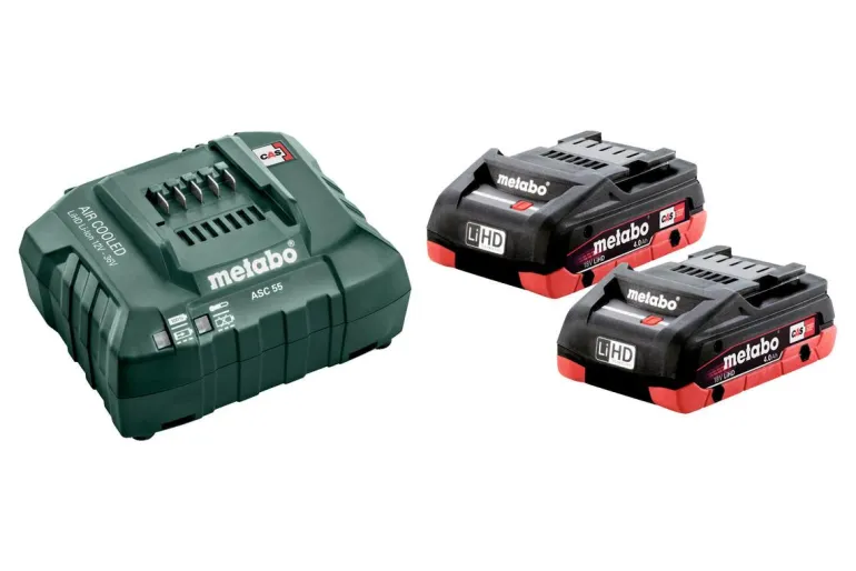 Metabo 685163000 on akkusarja kahdella akulla ja latauslaitteella. 2 x 18 V, 4,0 Ah-akkua ja latauslaite ASC 55.