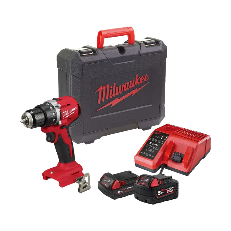 Milwaukee PowerPack M18 BLDDRC-522C M18™ kompakti hiiliharjaton porakone/ruuvinväännin kahdella akulla (1 x 2,0 Ah REDLITHIUM™ akku ja 1 x 5,0 Ah REDLITHIUM™ akku), laturilla ja laukulla.