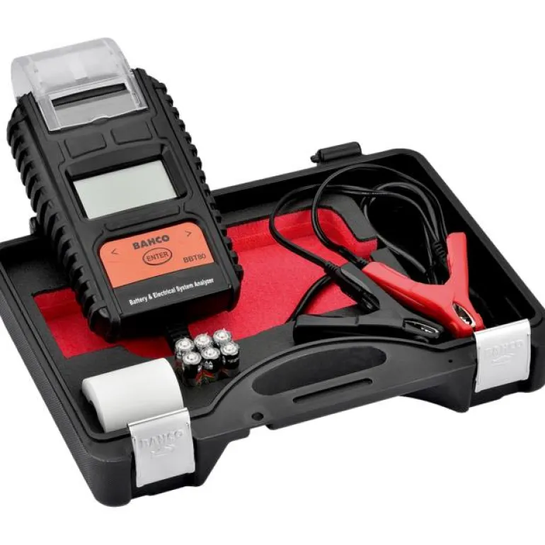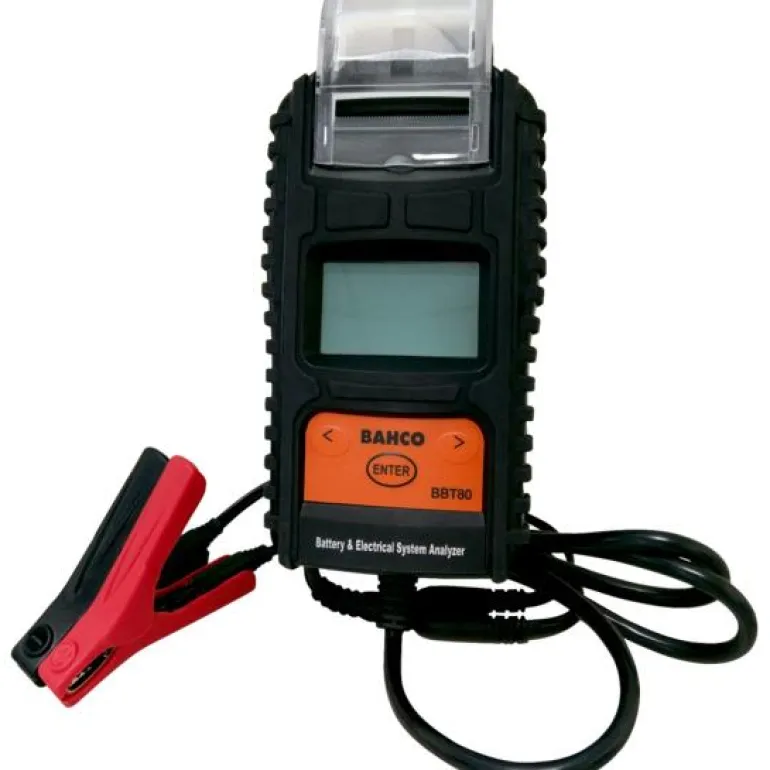 Bahco BBT80 on digitaalinen tulostimella varustettu akkutesteri, joka antaa nopean, varman ja selkeän diagnoosin. 12 V:n start&stop-akkujen testaukseen. 2-rivinen taustavalaistu LED-näyttö, joka näyttää latauksen ja akun kunnon prosentteina. Toimitukseen sisältyy tukeva muovilaukku, kuusi AA-paristoa ja käyttöohje.