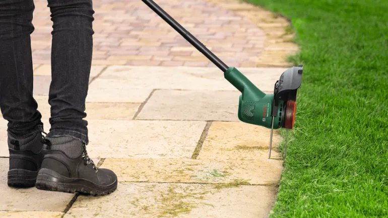 Sen kahvan yläosassa olevan EdgeSimple-toimintopainikkeen avulla voit vaihtaa kätevästi nurmikon viimeistelystä reunojen leikkaukseen painamalla nappia ja kääntämällä työkalun pään reunaleikkuuasentoon. Työkalun puoliautomaattinen kela syöttää lankaa napin painalluksella. Akun ollessa täyteen ladattu trimmeri pystyy leikkaamaan kuuden tenniskentän reunat. Työkalu kuuluu POWER FOR ALL ALLIANCE -järjestelmään. Yhdellä akulla voi käyttää monia erimerkkisiä työkaluja.
