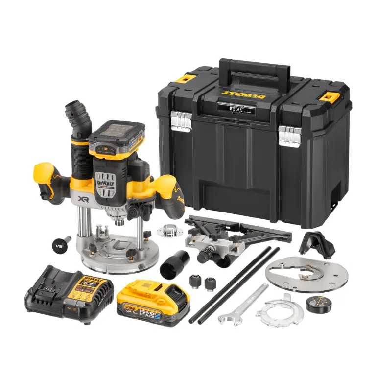Dewalt 18 V XR 8 mm / 12 mm (½”) hiiliharjaton akkukäsiyläjyrsin. Kompakti ja kevyt rakenne, ja uusi moottori, joka tuottaa jopa 1700 W:n huipputehon. Dewaltin antirotaatiotekniikka tunnistaa työkalun äkilliset liikkeet ja pysäyttää sen tarvittaessa äkillisen rotaation sattuessa tai jos hallinta menetetään. Punainen merkkivalo syttyy, kun antirotaatiojärjestelmä on aktivoitunut. Mahdollistaa oikean leikkuunopeuden valinnan useille terähalkaisijoille ja materiaalityypeille. Säilyttää tasaisen kierrosluvun myös kuormituksen kasvaessa, eikä hidastu vaativissakaan töissä, mikä mahdollistaa laadukkaan pinnan laadun. Langaton työkalun hallinta mahdollistaa automaattisen yhteyden työkalun ja yhteensopivan pölynpoistolaitteen välillä. Suora Air-Lock-liitäntä. Integroitu pölynpoisto suoraan pylvään kautta. Pohjassa olevat urat parantavat pölynpoistoa entisestään, erityisesti reunatyöstössä. 70 mm:n upotussyvyys mahdollistaa myös syvemmät työstöt. Työkalussa lisäksi ergonominen liipaisinkytkin, upotuksen lukitussalpa sekä portaaton nopeudensäätö. Toimitukseen sisältyy 2 × DCBP518 5 Ah Powerstack -akkua, DCB1104 -laturi, 8 mm ja 12 mm kiristysholkit, 30 mm ohjainholkki, sivuohjain, keskityskartio, 2 pohjaosaa (ohjainholkille ja suuremmalle aukolle), 22 mm avain, AirLock -sovitin, 2 pölykourua ja syvä TSTAK-laatikko.