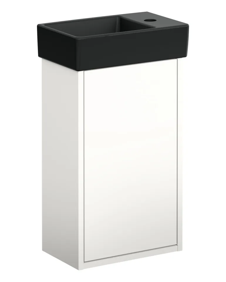 Gustavsberg Artic Small pesuallaskaappi, musta saarniviilu/mattamusta. Kaapissa on pehmeästi sulkeutuva Soft Close -ovi pehmeää sulkeutumista varten ja aukko lattiaan suunnatulle viemäriputkelle. Allas vasemmalla.