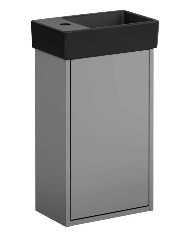 Gustavsberg Artic Small pesuallaskaappi, valkoinen/mattamusta. Kaapissa on pehmeästi sulkeutuva Soft Close -ovi pehmeää sulkeutumista varten ja aukko lattiaan suunnatulle viemäriputkelle. Allas vasemmalla.