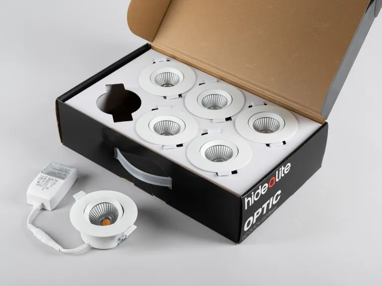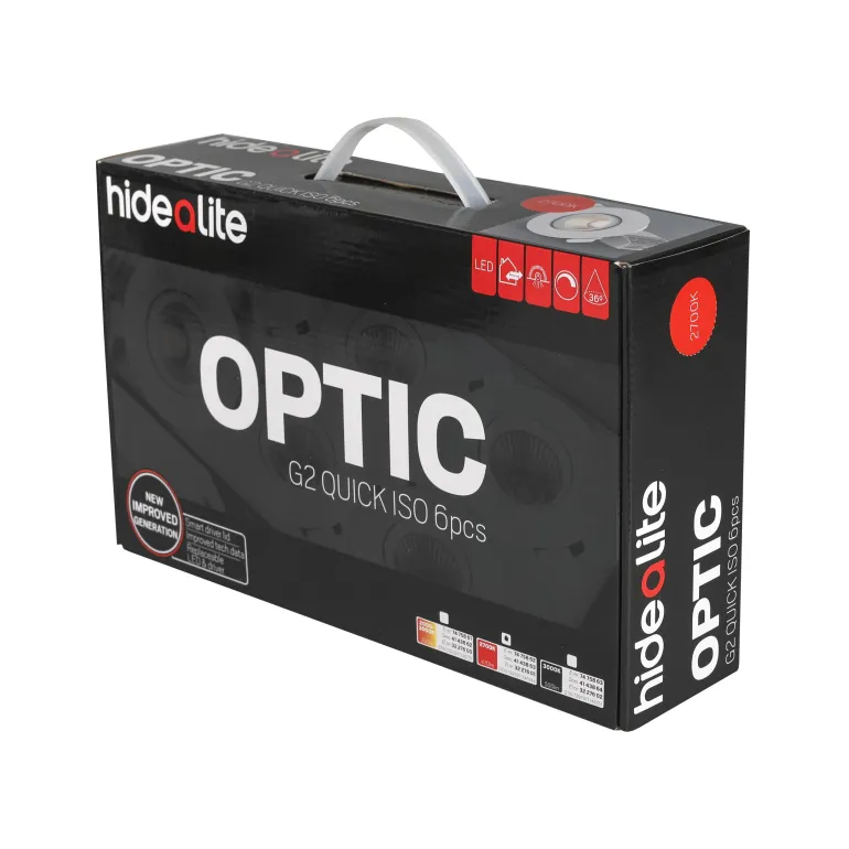 Hide-a-lite Optic G2 Quick ISO on alasvalo modernilla LED- ja heijastintekniikalla sekä häikäisemättömällä valokuviolla. Matalarakenteinen, sopii täydellisesti 28 mm:n harvalaudoitukselle ja 13 mm:n kipsilevylle. Moduulijärjestelmän ansiosta voit helposti purkaa valaisimen osiin ja säästää aikaa jos valonlähde on vaihdettava. Sopii asennettavaksi suoraan eristettä vasten. Suunnattavissa 30°, joten valaisin on täydellinen valinta kaltevaan kattoon. Erittäin hyvä värintoisto, Ra>95. Liitäntälaite on varustettu kannella joka voidaan ilman työkaluja mukauttaa kaapelille tai taipuisalle 16 mm:n suojaputkelle. 3-napainen pikaliitin ketjutusta ja vedonpoistoa varten. Valaisin voidaan himmentää markkinoiden tavallisimmilla himmentimillä. Kätevä 6-pakkaus.