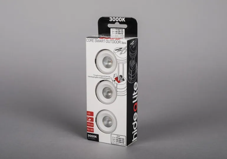 Hide-a-Lite Core Smart Outdoor on pieni LED-spottivalaisin sekä sisä- että ulkoasennukseen. Kätevä integroitu pikaliitin, joka helpottaa sarjaankytkentää, poistaa ulkoisten jatkoliitosten tarpeen ja minimoi virhemahdollisuudet. Soveltuu erinomaisesti uppo- tai pinta-asennukseen esim. räystään alapintaan ja kylpyhuoneeseen. Vakiona IP44 alapuolelta ja käytettäessä mukana toimitettavaa silikonitiivistettä IP44 kauttaaltaan. Ohjain tilataan erikseen joko himmennettävänä tai ei-himmennettävänä.