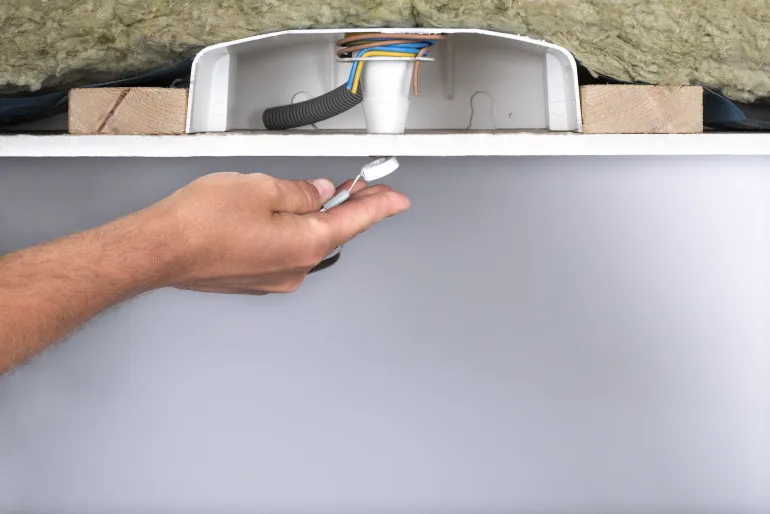 Kun Spot Finder on Spot Guard Glesissa, voidaan helpolla ja nopealla magneettietsinnällä löytää oikea paikka reikien poraamiselle, kun katto on valmis. Johdot voi kiertää kelalle niin, että ne eivät jää puristuksiin kipsilevyn Spot Guard Glesin väliin eivätkä osu poranterään