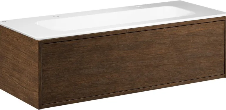 Gustavsbergin Ducentic -pesuallaskaappi keraamisella tai kivisellä allastasolla. Valittavissa myös tukikehyksellä tai ilman sekä yhdellä tai useammalla hanareiällä. Tasossa/pesualtaassa on kaksi hanareikää yhtä kaksireikäistä hanaa varten.