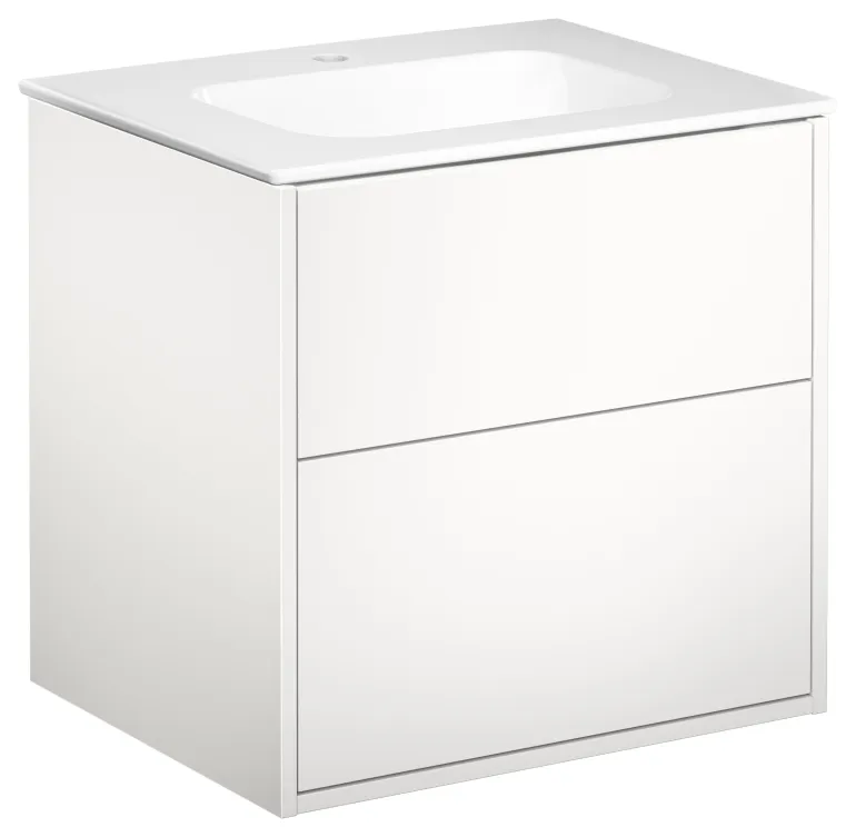 Valkoinen pesuallaskaappi, jossa on kaksi laatikkoa ja valkoinen pesuallas, 60 cm. Pesuallaskaapissa on täysin katettu, ohut posliininen pesuallas, jossa reilusti laskutilaa.