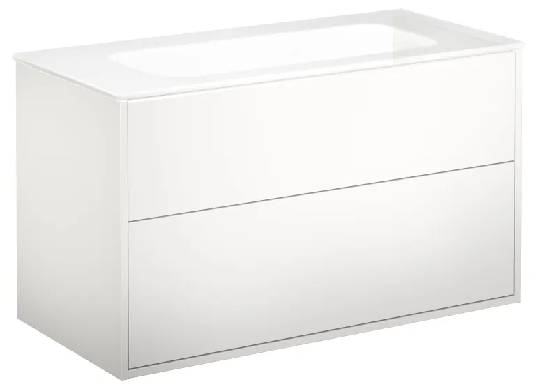 Valkoinen pesuallaskaappi kahdella laatikolla, ilman pesuallasta, 100 cm. Hiljaisesti ja pehmeästi sulkeutuvat, täysin ulosvedettävät vetolaatikot, joissa kaikki tarvikkeet ovat hyvin näkyvillä.