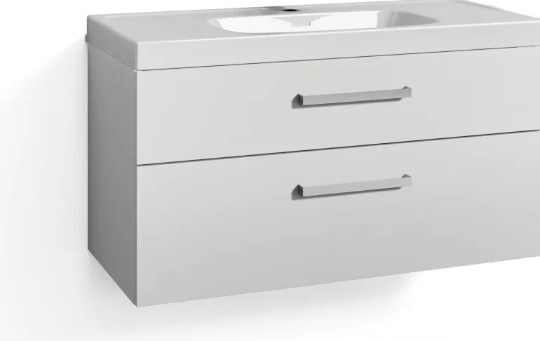 Svedbergs Signum 270360 on allaskaappi pesualtaalla ja kahdella laatikolla. Valkoinen, kosteutta kestävä kalustelevy.