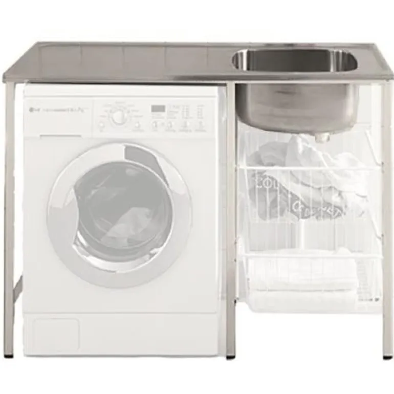 Allaskaappi, jossa paikka pesukoneelle. Pöytätaso on kuviovalssattua ruostumatonta terästä, ja kaappi on käännettävissä. Toimitetaan valmiiksi koottuna.
