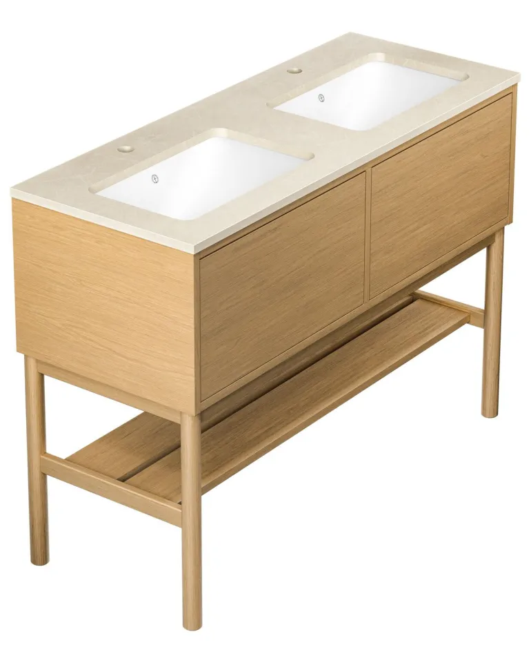 Gustavsbergin Ducentic -pesuallaskaappi keraamisella tai kivisellä allastasolla. Valittavissa myös tukikehyksellä tai ilman sekä yhdellä tai useammalla hanareiällä. Tasossa/pesualtaassa on kaksi hanareikää yhtä kaksireikäistä hanaa varten.