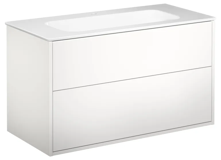 Valkoinen pesuallaskaappi, 100 cm, jossa on kaksi laatikkoa ja valkoinen pesuallas, jossa on yksi hanareikä. Pesuallaskaapissa on täysin katettu, ohut posliininen pesuallas, jossa reilusti laskutilaa.