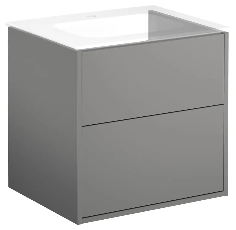 Tuhkanharmaa pesuallaskaappi kahdella laatikolla, ilman pesuallasta, 60 cm. Hiljaisesti ja pehmeästi sulkeutuvat, täysin ulosvedettävät vetolaatikot, joissa kaikki tarvikkeet ovat hyvin näkyvillä.