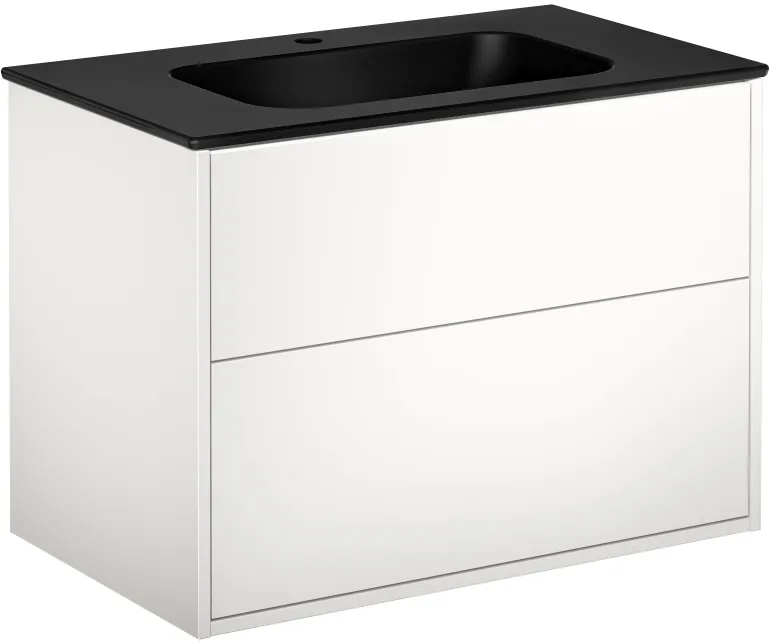 Valkoinen pesuallaskaappi, jossa on kaksi laatikkoa ja mattamusta pesuallas, 80 cm. Pesuallaskaapissa on täysin katettu, ohut posliininen pesuallas, jossa reilusti laskutilaa.