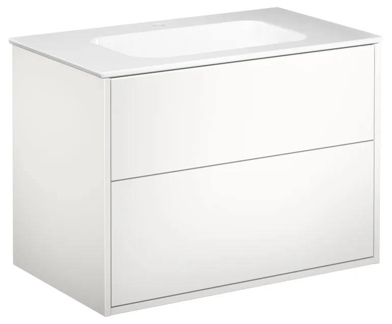 Valkoinen pesuallaskaappi, jossa on kaksi laatikkoa ja valkoinen pesuallas, 80 cm. Pesuallaskaapissa on täysin katettu, ohut posliininen pesuallas, jossa reilusti laskutilaa.